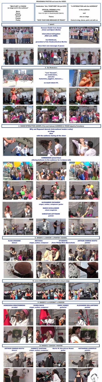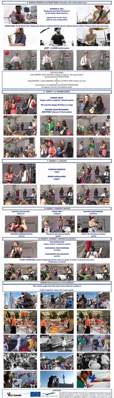 | Le spectacle « TOUS ENSEMBLE » est un spectacle MULTI-ARTISTIQUE 40 à 60 artistes (musiciens, chanteurs, danseurs, artistes de cirque, acteurs, peintres)
