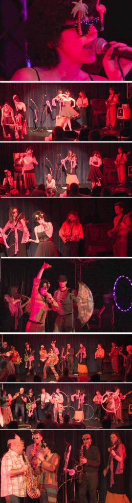 - À chaque chanson, un nouveau chanteur, accompagné d'un nouveau peintre, danseur, acteur et artiste de cirque, entre en scène.